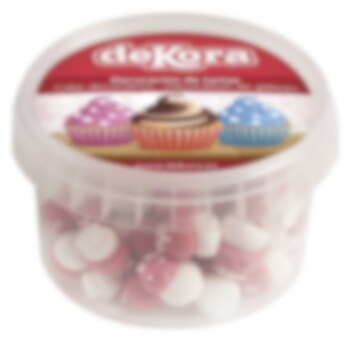 Sokeri, maissitärkkelys, maitoproteiini, vesi, väriaineet (E100, E120, E133, E160a), happamuudensäätöaine (E330), säilöntäaine (E202).