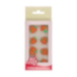 16 kpl. sokerikoristeita, jotka esittävät pieniä porkkanoita. Hauskoja koristeita kakkuun tai leivonnaisiin pääsiäiseksi tai vaikka herkulliseen porkkanakakkuun. Porkkanat ovat noin 1 x 2 cm kokoisia.