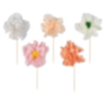 12 kpl. suloisia cake toppers -koristeita, jotka on muotoiltu kauniiksi kukiksi. Koristele niillä kuppikakkuja tai kakku. Kukat ovat kiinni puutikuissa ja ne on tehty paperista.