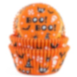 50 kpl. oransseja muffinssivuokia kauniilla kuvioilla ja tekstillä "Boo!" "Boo!" pohjassa. Täydellisiä muffinssien leipomiseen Halloween-juhliin. Noin 5 cm kokoinen.