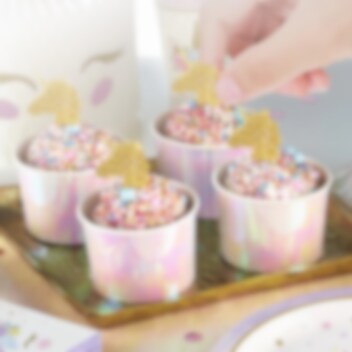 12 kpl juhlatikkuja, joissa on hieno, kultainen yksisarvisen pää. Koristele synttärikakku tai kuppikakut juhlatikuilla. Tikun korkeus on n. 8 cm.