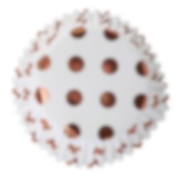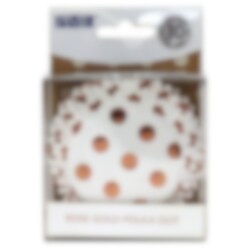 30 kpl valkoisia muffinssimuotteja, joissa on ruusukultaisia foliopilkkuja. Käytä näitä, kun leivot makeita leivonnaisia juhliin. Muottien pohja on n. 5 cm.