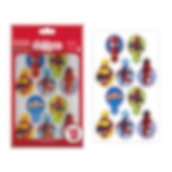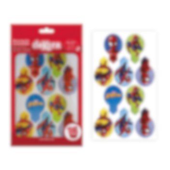 20 kpl vohvelista tehtyjä muffinikoristeita hienolla Spiderman-aiheella. Täydelliset muffinsseihin Spiderman-teemaisiin juhliin. Muffinikoristeet ovat halkaisijaltaan noin 4,5 cm. Ainesosat: Perunatärkkelys, vesi, oliiviöljy, maltodekstriini, väriaineet (E102, E122, E133, E151). Säilytä viileässä ja kuivassa.