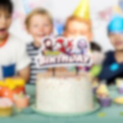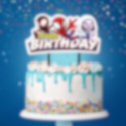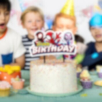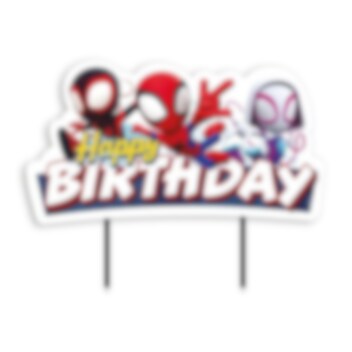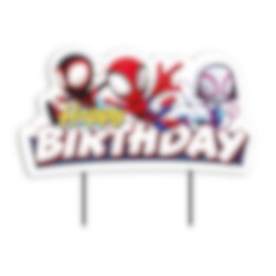 Cake Topper pahvista. Siinä on teksti "Hyvää syntymäpäivää" ja monia hauskoja kuvioita Spidey and His Amazing Friends -sarjasta! Korkeus noin 13 cm.