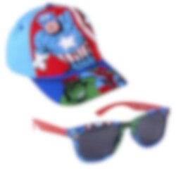 Täydellinen setti jossa on upea sinipunainen lippis, jossa on Avengersin supersankarit sekä huippuluokkaiset aurinkolasit, molemmat lasten kokoa. Aurinlolaseissa on Hulkin, Kapteeni Amerikan ja Spidermanin kuvat.