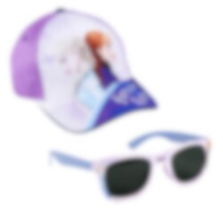 Täydellinen paketti, jossa on kaunis Anna&Elsa-lippis sekä huippuluokkaiset aurinkolasit, molemmat lasten kokoa. Aurinkolaseissa on Disneyn Frozen-menestyselokuvasta tuttujen siskosten kuvat ja teksti "Forever sisters". Laseissa on vaaleanpunaista ja vaaleansinistä.