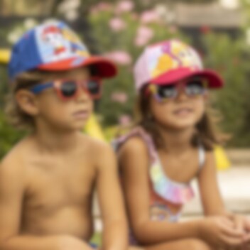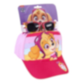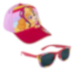 Täydellinen paketti, jossa on söpö vaaleanpuna-punainen lippis sekä huippuluokkaiset aurinkolasit, molemmat lasten kokoa. Aurinkolaseissa on söpö Kaja-pentu Ryhmä Hau -elokuvasta.
