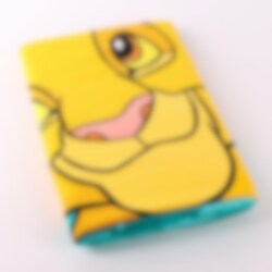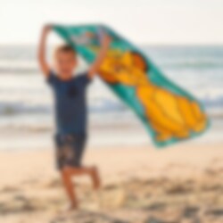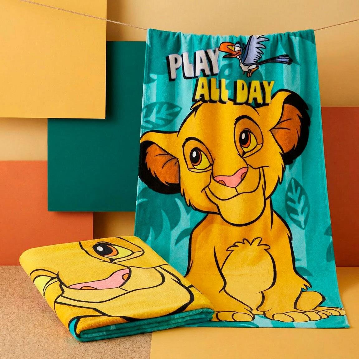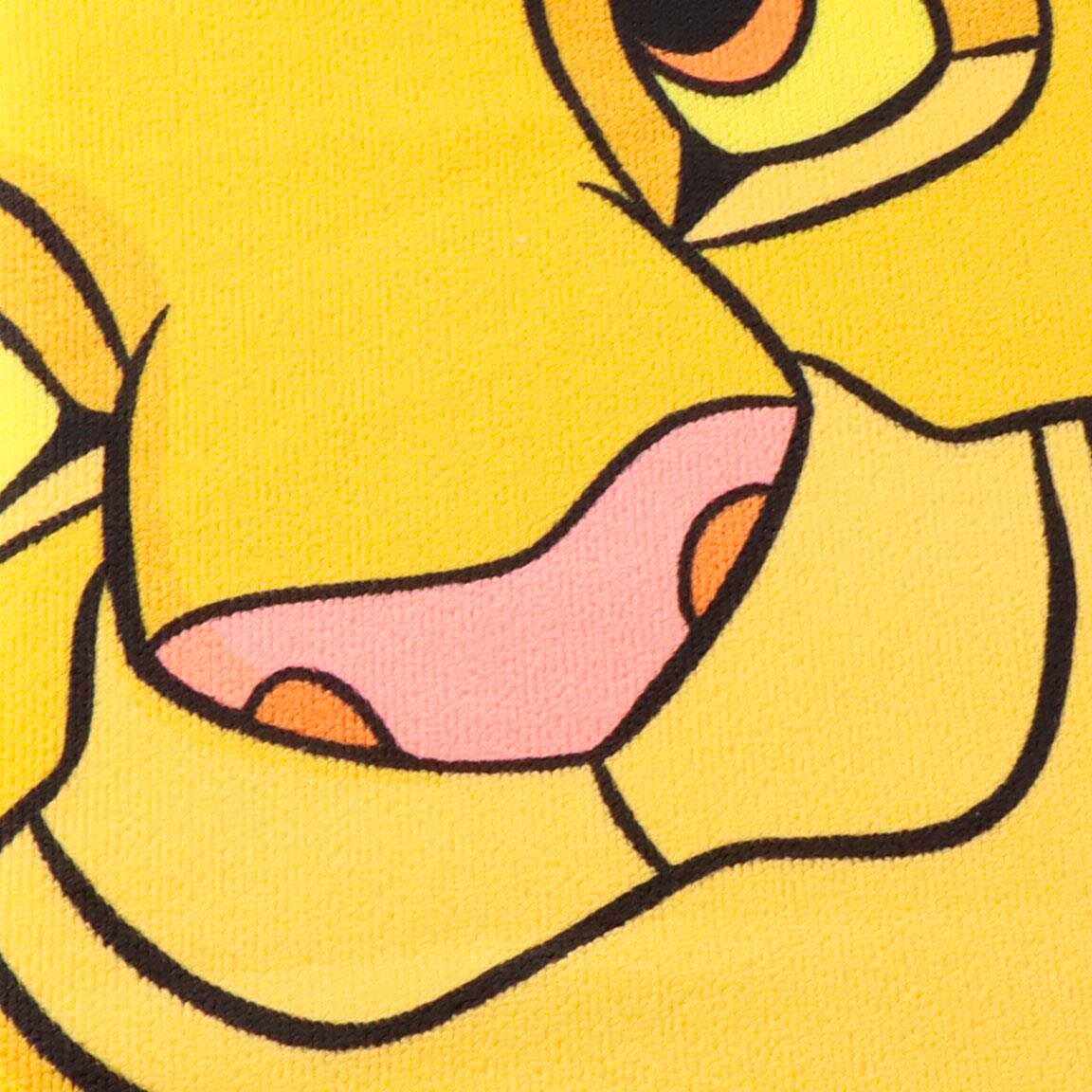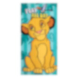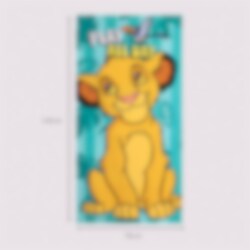 Anna Leijonakeisarin seikkailujen tulla mukaan rannalle tämän värikkään kylpypyyhkeen kanssa. Kuva esittää iloisen Simban valmiina leikkiin, kun taas ystävä Zazu lentää yläpuolella turkoosia viidakkolehdillä kuvioitua taustaa vasten.