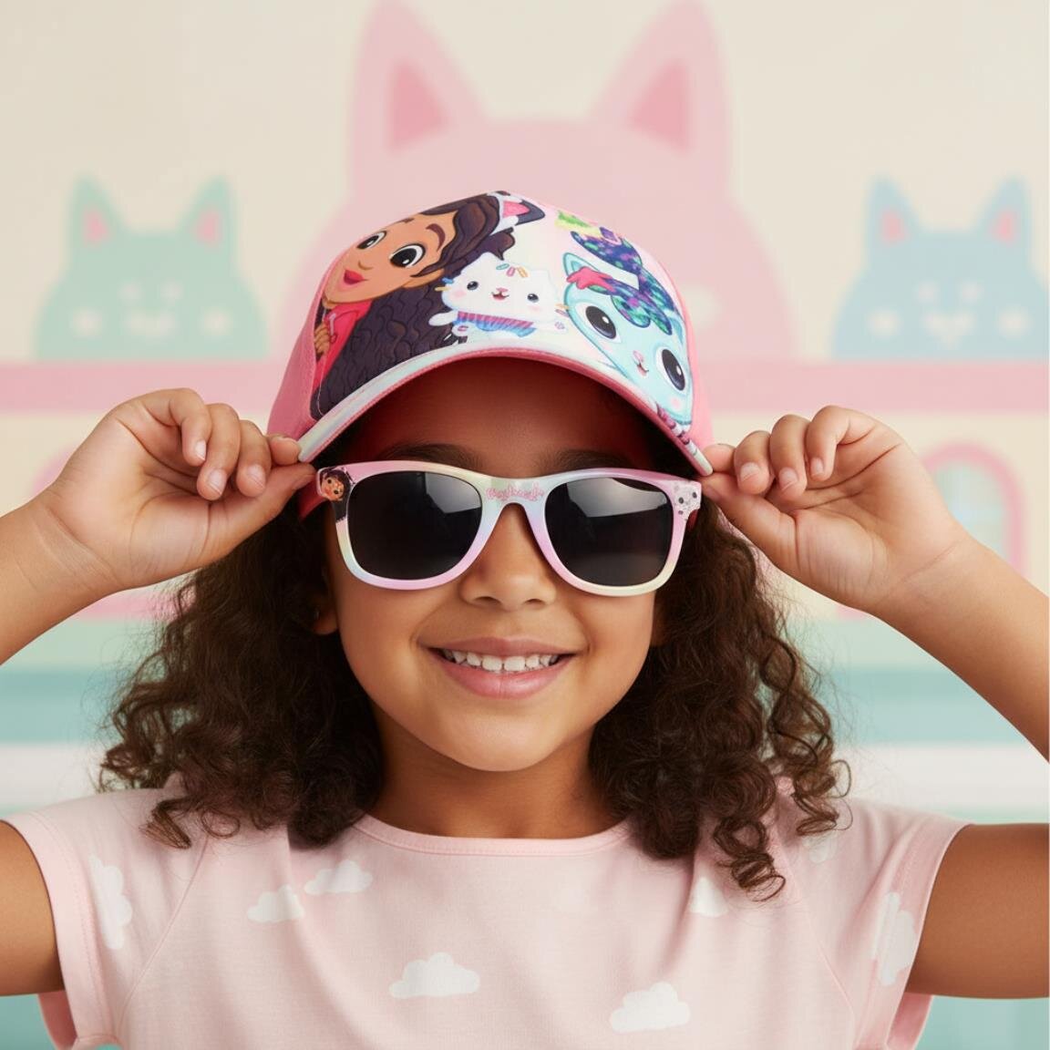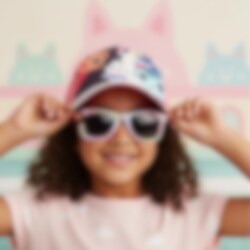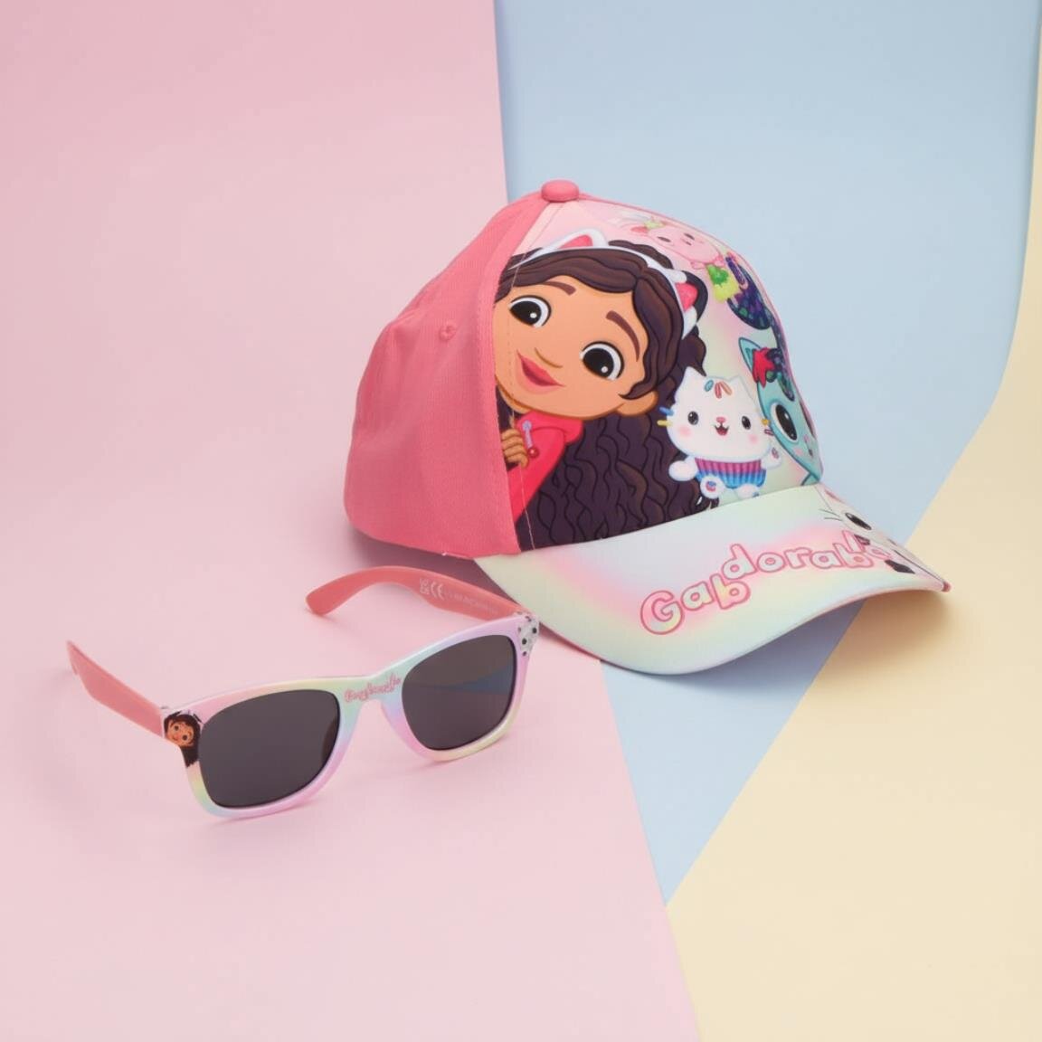 Värikäs setti, jossa on lippis ja aurinkolasit Gabby's Dollhouse -teemalla, täydellinen aurinkoisille päiville ja ulkoleikkeihin. Kuvat tekevät setistä suosikin pienten fanien keskuudessa.