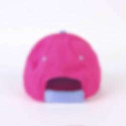 Söpö lasten Pipsa Possu -lippis lilan ja vaaleanpunaisen sävyissä. Lippis on valmistettu 65 % puuvillasta ja 35 % polyesteristä. Lippiksessä on 51 cm ympärysmitta ja se on säädettävissä takaa, joten se sopii yleensä noin 2–4-vuotiaille lapsille.