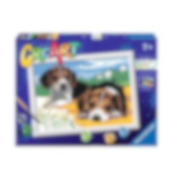 Maalaussetti ihanalla Jack Russelin pentujen kuvalla sopii täydellisesti nuorelle aloittelevalle taiteilijalle. Luova harrastus niille, jotka rakastavat maalaamista ja numeroiden seuraamista. Tämä setti on tarkoitettu 7-vuotiaille ja sitä vanhemmille. Maalauksen koko on valmiina noin 18 x 24 cm.