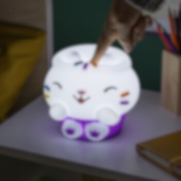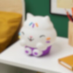 Suloinen Cakey Cati tuo pehmeää ja miellyttävää valoa huoneeseen. Lamppu on valmistettu pehmeästä silikonista ja se esittää Cakey Catia klassisessa asennossaan. Siinä on kolme valotilaa, joita voi helposti vaihtaa painamalla päätä. Sisäänrakennettu ajastin sammuttaa lampun automaattisesti hetken kuluttua. Täydellinen satuhetkeen ja nukkumaanmenoaikaan tai sisustuselementiksi kaikille, jotka rakastavat Gabby's Dollhousea.