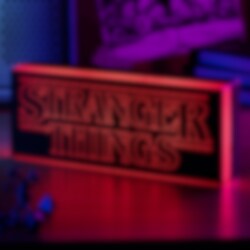 Hieno lamppu, jossa Stranger Things -logo loistaa punaisena.