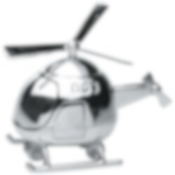Hopeapäällysteinen säästörasia, joka kuvaa helikopteria. Yllättävä ja ihana kastelahja annettavaksi kastettavalle lapselle. 13 x 12 cm.