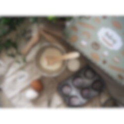 Hauska leivontasetti, jossa on 13 eri osaa. Kaikki on pakattu söpöön vihreäraidalliseen pahvilaukkuun, jossa on kahva. Kaikki, mitä pieni leipuri tarvitsee keittiössä. Tämän leivontasetin avulla lapsi voi pitää hauskaa pitkään. Peltiä voidaan käyttää tavallisessa uunissa varsinaiseen leivontaan.
