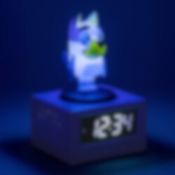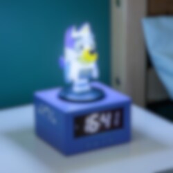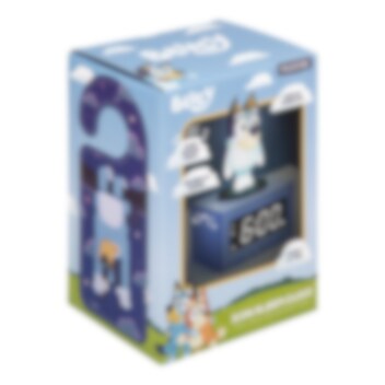 Aloita päivä parhaalla mahdollisella tavalla tämän ihanan Bluey-herätyskellon avulla! Digitaalinen kello on noin 16 cm korkea ja sen päällä on valaistu Bluey-hahmo. Kellossa on musiikillinen herätys joka aamu. Paina Blueyn päätä aktivoidaksesi torkkutoiminnon. Kun painat päätä, siihen syttyy lisäksi yövalotoiminto, joka on täydellinen tuomaan pehmeää valoa makuuhuoneeseen. Hauska ja käytännöllinen yksityiskohta kaikille Bluey-faneille.