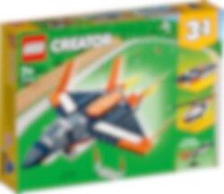 Tämä huikea LEGO® Creator 3in1 Yliäänikone (31126) rakennussetti vie 7 vuotta täyttäneet lapset vauhdikkaisiin leikkeihin yläilmoihin tai vesille. Mukana on huippunopea suihkari, jossa on ohjaamo, sisäänvedettävät pyörät, liekkejä syöksevä moottori ja esittelyjalusta. LEGO leluja mielikuvitusleikkeihin Vauhdikkaista leikeistä pitävät LEGO fanit voivat rakentaa tästä LEGO Creator 3in1-setistä 3 erilaista mallia aitoine yksityiskohtineen. Rakenna ensin yliäänikone, jonka osista voi sitten rakentaa helikopterin tai pikaveneen. Tai rakenna 215 palikasta ikioma huikean hieno menopeli. Digitaalinen elämys LEGO rakentelijoille Settiin kuuluvien interaktiivisten digitaalisten rakennusohjeiden avulla rakennuselämys sujuu hauskemmissa merkeissä. LEGO Building Instructions sovellus ladataan älypuhelimeen ja tablettiin, ja lasten on helppo hahmottaa rakentamansa malli sovelluksen zoomaus‑ ja kiertotyökaluilla.