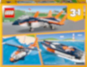 Suuntaa uskomattomiin seikkailuihin yläilmoissa tai vesillä! Hyppää huikean yliäänikoneen puikkoihin ja tee taivaalla temppuja, jotka saavat pään pyörälle. Rakenna osista sitten helikopteri, jossa on pyörivät lavat, ja suuntaa takaisin korkeuksiin. Tai rakenna pikavene ja kiidä vesille vauhdikkaisiin hupihetkiin. Tämä 3in1-setti on täpötäynnä tarinoita.