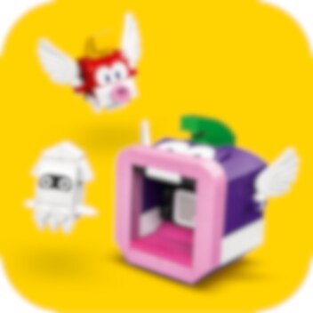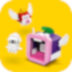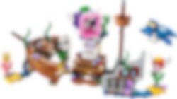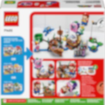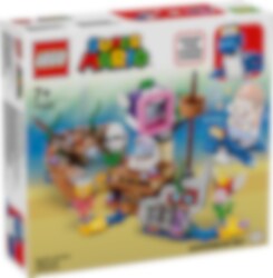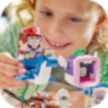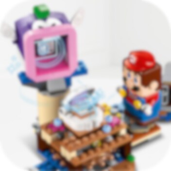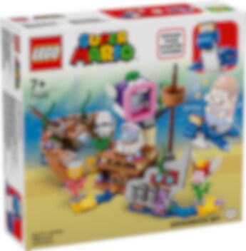 Lähde etsimään aarteita vedenalaisesta maailmasta! Laita LEGO® Mario, LEGO® Luigi tai LEGO® Peach hahmo (eivät sisälly pakkaukseen) Dorrien selkään ja lähde tutkimaan laivanhylkyä. Mutta voi ei! Aarrearkku on lukossa, joten sinun on etsittävä avain. Katso löytyisikö se laivan maston liepeiltä, mutta varo, ettei Cheep Chompin pääse nappaamaan sinua! Pyöräytä alustaa ja avaa simpukka, niin löydät avainkuution. Avaa sitten aarrearkku ja nappaa jalokivi talteen!