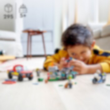 Varo, kissanpentu! SKRIIK... PAM! Rosvo on kiihdyttänyt tiehensä ryöstösaalis säkissä, mutta täräyttänyt pakoautollaan päin liikennevaloa, ja kaupungissa on syttynyt tulipalo. Kiidä pakenevan roiston perään poliisimoottoripyörällä! Nouse sitten palokunnan lava-auton kyytiin LEGO® City TV:n palomies-Bobin kanssa ja suuntaa tapahtumapaikalle. Liekit voi sammuttaa palokunnan upealla dronella! Mahtavat seikkailut odottavat LEGO Cityssä!
