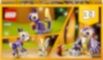 LEGO® Creator 3in1 Mielikuvitusmetsän olennot (31125) rakennussetin parissa 7 vuotta täyttäneet lapset voivat uppoutua taianomaisiin tarinoihin, joissa seikkailevat söpöt metsäneläimet. Mukana on viisas pöllö, jonka pään, pyrstön, jalat, siivet ja sulat voi laittaa eri asentoihin ja joka lukee tarinaa siilille. 3in1-leluilla lentävä lähtö luoviin leikkeihin Tästä upeasta LEGO 3in1-setistä lapset voivat rakentaa 3 erilaista hassunhauskaa mallia. Rakenna ensin viisas pöllö ja siili, ja sommittele samoista osista sitten pieni peura ja kani tai tammenterhoa mutusteleva orava. Tai rakenna 175 palikasta kokonaan uusi eläin. Digitaalinen elämys LEGO rakentelijoille Eläinaiheiseen lelusettiin kuuluvien interaktiivisten digitaalisten rakennusohjeiden avulla rakennuselämys sujuu hauskemmissa merkeissä. Ilmainen LEGO Building Instructions sovellus ladataan älypuhelimeen ja tablettiin, ja lasten on helppo hahmottaa rakentamansa malli sovelluksen zoomaus‑ ja kiertotyökaluilla.