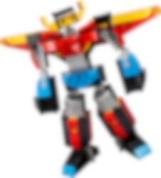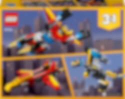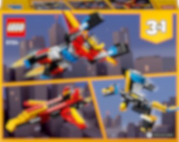Tämä huikea superrobotti vie sinut matkalle tulevaisuuteen uskomattomien seikkailujen pariin! Vahva robotti suojelee kaupunkeja tai levittää siipensä lentääkseen kohti korkeuksia. Robotin osista voi rakentaa liikuteltavan lohikäärmeen tai huippunopean suihkarin, jonka siipiä voi säätää. Vauhdikkaat futuristiset tarinat odottavat! Voit myös rakentaa tämän upean 3in1-setin palikoista jotain ihan uutta. Sinä päätät!