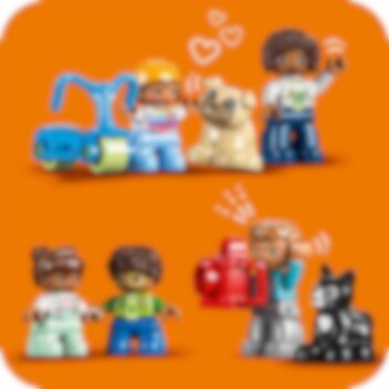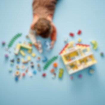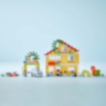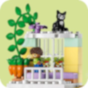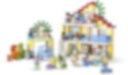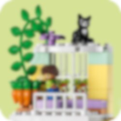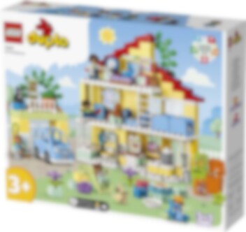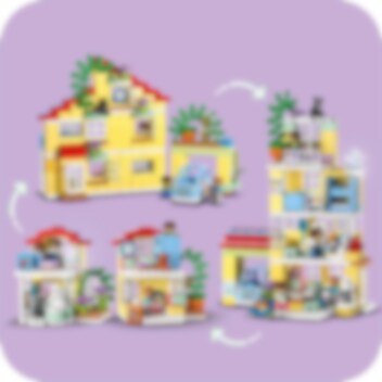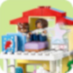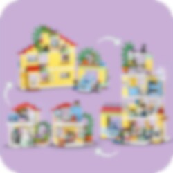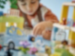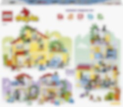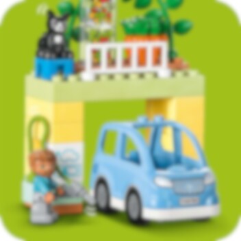 Tervetuloa leikkimään LEGO® DUPLO® Kaupunki 3-in-1 omakotitalo (10994) lelulla, jonka parissa lapset oppivat uusia taitoja! Talo on täynnä aitoja yksityiskohtia ja sen parissa yli 3-vuotiaat lapset uppoutuvat koko perheen yhteisiin hauskoihin leikkihetkiin yhdessä vanhempiensa kanssa. Mukana on 7 hahmoa, joilla vanhemmat voivat tukea sosiaalisten taitojen opettelua ja lapset oppivat ilmaisemaan itseään. Kotileikkien ystäville Tämä rakennettava talo on monipuolinen lelu varhaiskasvatuksen tueksi. Leikki-ikäiset voivat käydä läpi nukkumaanmenorutiineja, kuten hampaiden harjauksen ja iltasadun kerrossänkyyn peiteltynä. Tähtilamppu valopalikkoineen luo kotoisaa tunnelmaa makuuhuoneeseen. Keittiössä voi tutustua terveelliseen ravintoon ja puutarhassa poimia tomaatteja ja porkkanoita. Autotallissa on rakennettava sähköautolelu, jonka voi ”ladata” aurinkopaneeleilla. Autossa on hauska työntömoottori leikkejä varten. Oikeasti luovaa rakentelua Talon voi rakentaa 3 eri tavalla, joten leikkihetkiin riittää vaihtelua. Lapset voivat rakentaa yhden suuren 3-kerroksisen talon, korkea lelurakennuksen tai 2 pienempää asuntoa, joita puutarha yhdistää.