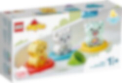 LEGO® DUPLO® Ensimmäisiin hauskoihin kylpyhetkiin: kelluva eläinjuna (10965) on kehittävä kylpylelu, joka on helppo puhdistaa ja sopii yli 1,5-vuotiaille lapsille. Kelluva kylpylelu, joka on helppo puhdistaa Pikkuisesi kylpyhetkestä tulee entistäkin hauskempi, kun suloiset virtahepo, ankka ja jääkarhu liittyvät mukaan. 3 eläintä istuu erivärisillä, kelluvilla renkailla, jotka voi kiinnittää toisiinsa. Mukana on myös sanko eläinten pesuun ja pilvi, josta sataa vettä. Lapsi voi yhdistää ja irrottaa renkaat helposti, sillä niissä on pyöristetyt koukut, jotka voi myös yhdistää näihin setteihin: Hauskoihin kylpyhetkiin: kelluva kultapanda 10964 ja Hauskoihin kylpyhetkiin: kelluva eläinsaari 10966 (setit myydään erikseen). Renkaat voi avata ja huuhdella, joten ne on helppo pitää puhtaana kylvystä toiseen. Pienet lapset oppivat leikin varjolla Vanhemmat saavat olla mukana tärkeissä kehitysaskelissa, kun lapset saavat loputtomiin leikkeihin, itseilmaisuun ja hauskaan tutkiskeluun innoittavat LEGO DUPLO lelut käsiinsä.
