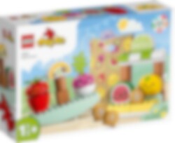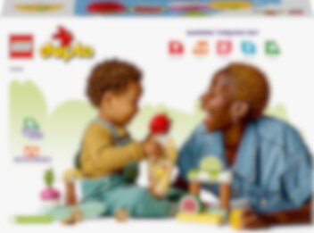 LEGO® DUPLO® Ensimmäinen luomutorini (10983) tutustuttaa pienet lapset ostamisen ja myymisen maailmaan. Suloisella torilelusetillä lapset pääsevät leikkimään arjen tapahtumia punnitessaan tuotteita vaa’alla, maksaessaan eriarvoisilla lelukolikoilla ja kantaessaan ostokset kotiin hienossa kangaskassissa. Opetuslelujen parissa pidetään hauskaa Lapset harjoittavat tasapainotaitojaan retiisi-, mansikka-, sitruuna- ja vesimelonileluja pinoamalla. Kaikki LEGO DUPLO lelut on kehitetty vahvistamaan itseilmaisua, ja tässä setissä jokaisella ruokapalikalla on erilainen ilme, joten mielikuvitusleikit heräävät henkiin! Opettavaisia leluja taaperoiden rakennusleikkeihin Leikki-ikäisten käsissä LEGO DUPLO lelut taipuvat loputtomiin oppimisleikkeihin, joissa itseilmaisu kehittyy ja pidetään hauskaa. Tämä setti innostaa taaperot ja aikuiset interaktiiviseen leikkiin, jossa toinen on torimyyjä hedelmä- ja vihanneskojulla ja toinen asiakas. DUPLO-leikkisettien parissa vanhemmat ja pienet lapset pääsevät jakamaan tärkeät kehitysaskeleet yhdessä leikkien ja rakennellen.