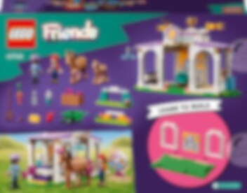 Yli 4-vuotiaat hevosista ja eläintenhoidosta pitävät lapset voivat uppoutua mielikuvitustarinoiden maailmaan LEGO® Friends Ratsastustunti 41746 tallirakennussetillä. Lelusetin parissa lapset oppivat rakentamaan ja mukana ovat Aliya‑ ja Mia-mininuket sekä 2 hevoshahmoa ja tarvikkeita monenlaisiin leikkeihin. Lapset voivat tutustua kahteen hevosrakkaaseen ihmiseen: Aliyaan ja tämän ystävän äitiin, Miaan. Innosta uusia rakentelijoita LEGO 4+ settien parissa lapset voivat uppoutua nopeaan ja hauskaan rakennuselämykseen. Mukana on aloituspalikka, josta hauskojen tapahtumien rakentelu on näppärä aloittaa. LEGO Builder sovellus opastaa sekä sinua että lastasi intuitiivisessa rakennusseikkailussa. Voit zoomata ja käännellä malleja 3D-näkymässä, tallentaa settejä ja seurata edistymistä. Heartlake Cityn uusi sukupolvi Lapset saavat uusia ystäviä ja tutustuvat jännittäviin paikkoihin LEGO Friends maailmassa, jossa voi uppoutua oikeasta elämästä tuttuihin tarinoihin.