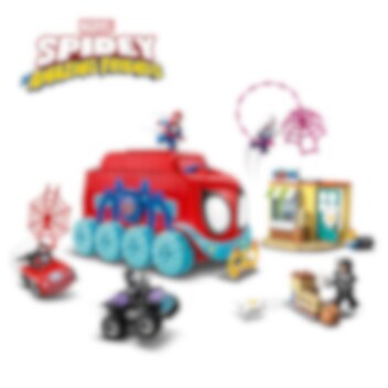 Yli 4-vuotiaille lapsille sopiva LEGO® Marvel Team Hämiksen liikkuva päämaja (10791) setti sisältää tuttuja hahmoja ja ajoneuvoja. Supersankareiden ajoneuvoja Setti sisältää 5 minihahmoa – mukana ovat Hämis, Ghost-Spider, Miles Morales, Musta Pantteri ja Rhino – sekä rakennettavan päämajan Hämikselle ja hänen tiimilleen. Liikkuvassa päämajassa on avattava ohjaamo ja takaovi, josta avoauto ja mönkijä voivat ampaista matkaan. Rhinolla on varusteenaan kananmunia tulittava pyssy, jolla hahmo tähtää kohti ruokakauppaa. Siellä on runsaasti aineksia ruokasotaa varten. Setti sisältää myös muita tarvikkeita, kuten seittiosia ja kadulle asetettavia kalusteita. 2 palikasta koostuvan alustan ja kuvatarinaohjeiden avulla lapset pääsevät helposti rakentelun alkuun. LEGO Builder sovelluksen zoomaus‑ ja kiertotyökaluilla lapset hahmottavat rakentamansa mallit. Työkalut tuovat elämykseen hauskan digitaalisen ulottuvuuden. Hupihetkiä koko perheelle 4+-settien parissa aikuisetkin saavat osallistua lasten hauskoihin rakennusleikkeihin. Setit sopivat niin LEGO konkareille kuin lapsille, jotka tutustuvat LEGO palikoihin ensimmäistä kertaa.