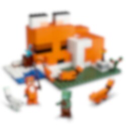 Erilaisten hahmojen, aitojen varusteiden ja loputtomien leikkimahdollisuuksien ansiosta LEGO® Minecraft® Kettuhuvila (21178) on täydellinen lahja yli 8-vuotiaille. Kiireinen päivä kettulassa Minecraft-taidoillaan lapset voivat rakentaa nukkuvan ketun muotoisen talon. Rakennus on takaa avonainen ja sen katon voi nostaa, joten talon sisällä voi helposti järjestellä huonekaluja ja leikkiä mielikuvitusleikkejä. Ulkona ovat ketunpoikanen, täysikasvuinen kettu ja napakettu, joille voi syöttää marjoja ennen kuin eläimet käpertyvät unille. Pelin suosikkihahmo, hukkunut zombi, saapuu paikalle aiheuttamaan kaaosta. Lasten on häädettävä se pois miekalla, jonka voikin sitten vaihtaa ongenvapaan ja lähteä kalaan.