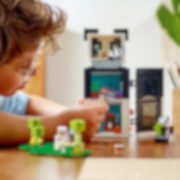 Jos Minecraft®-pandat ovat sinun juttusi, ihastut varmasti tähän 3-kerroksiseen pandataloon! Avaa takaosa ja tutustu eri huoneisiin, jotka ovat täynnä kivoja tarvikkeita luoviin leikkeihin. Kaipaatko pientä muutosta? Rakenna pandatalo uudelleen, niin että hahmo istuu tai on 4 jalkansa varassa. Suuntaa sitten ulos tutkimaan bambuviidakkoa. Syötä pandaemolle ja pikkupandalle kakkua, mutta varo varsijousella varustautunutta luurankoa!