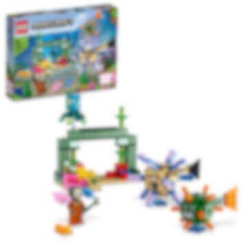 LEGO® Minecraft® Vartijoiden taistelu (21180) vie yli 8-vuotiaat pelaajat vedenalaiseen seikkailuun, joka on täynnä suosikkipelistä tuttuja hahmoja ja ominaisuuksia. Valtameren mitalla hauskuutta Minecraft-pelaajille Lapset voivat ottaa vastaan toiminnantäyteisen haasteen tämän kiehtovan, merenpohjaan sijoittuvan Minecraft-tehtävän parissa. Ensinnäkin koralliriuttojen keskelle pitää rakentaa monumentti. Siellä on kätketty aarre etsittäväksi, mutta 2 tunnettua Minecraft-joukkoa, vartija ja vanhempi suojelija, tekevät kaikkensa estääkseen sen löytymisen. Atraimella aseistettuna ja apunaan 3 avuliasta aksolotlia lasten täytyy häätää kimpustaan vihamieliset joukot, jotta he pääsevät jatkamaan tehtäväänsä. Vaaran tuntua lisää jousitoiminen ase, joka laukaisee laserohjuksen, kun vanhempi suojelija heiluttaa pyrstöään. LEGO palikoista rakennettava seikkailu kutsuu loputtomiin luoviin leikkeihin ja tuo Minecraftin jännittävät tapahtumat lasten ulottuville.