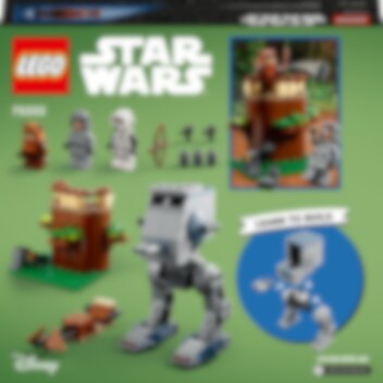 Lapset pääsevät opettelemaan rakentelua ja tutustumaan leikkeihin jännittävässä LEGO® Star Wars universumissa aloittelijalle sopivalla AT-ST-setillä (75332). Setti on mahtava lahjaidea yli 4-vuotiaille, ja se sisältää helposti rakennettavan 4+-version AT-ST-talsijasta, joka on tuttu elokuvasta Star Wars: Jedin paluu. Ajoneuvossa on miniohjaamo ja settiin kuuluvat Wicketin, tiedustelusotilaan ja AT-ST-kuljettajan LEGO minihahmot aseineen sekä kiituri ja Ewokin tähystyspaikka ja puu sekä katapultti leikkeihin, joissa käydään Endorin taistelua. Rakentelua sovelluksen avulla Digitaaliset ohjeet sekä zoomaus‑ ja kiertotyökalut löytyvät ilmaisesta LEGO Building Instructions sovelluksesta. Ne antavat luovaan elämykseen uuden ulottuvuuden. 4+-elämyksiä LEGO Star Wars 4+-rakennuslelujen parissa 4 vuotta täyttäneet lapset saavat tutustua LEGO rakenteluun ja Star Wars saagaan. Settien aloituspalikat auttavat lapsia rakentamaan ajoneuvoja, rakennuksia ja paljon muuta joko aivan itse tai isomman sisaruksen tai vanhemman avulla. Leikit pääsevät heti alkuun!