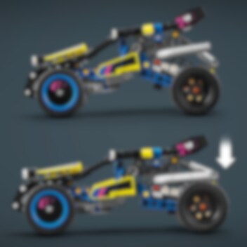 Tämän upean maastokirpun kyydissä riittää yllin kyllin hupia! Rakenna LEGO® Technic Maastokirppu kilpa-ajoihin ja laita menopeli sitten tositoimiin vauhdikkaaseen maastokirpputyyliin. Tutki jousitusta, 4-sylinteristä moottoria ja kallistamalla kääntyvää ohjausta. Kerrassaan huippuhieno maastokirppu!