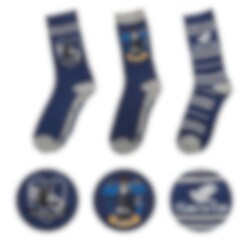 3 paria siniharmaita sukkia kauniilla Harry Potteri Ravenclaw -kuvilla. Loistava lahja Harry Potter -fanille. Sukat on valmistettu 98 % polyesteristä ja 2 % elastaanista ja ne sopivat kokoa 35-45 käyttäville Tämä on virallisesti lisensoitu tuote valmistajalta Cinereplicas.