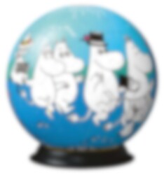 3D-palapeli Muumit-teemalla. Palapelin halkaisija on noin 13 cm. Pakkaus sisältää alustan, johon palapelipallo voidaan asettaa. Tähän palapeliin ei tarvita liimaa, vaan voit koota sen paloista.