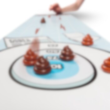 Hauska curling-peli sekä lapsille että aikuisille. Pelin tarkoituksena on, että se, joka pääsee lähimmäksi vessan vettä, voittaa. Peli sisältää: 1 pelilauta, joka kuvaa kylpyhuoneen lattiaa wc:llä sekä 6 heitettävää kakkaa 2 eri ruskean sävyisenä. Pelilaudan koko on 120 x 28 cm ja kakat ovat noin 2,8 x 2 x 5 cm.