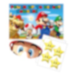 Juhlapeli Super Mario -synttäreiden viihdykkeeksi sinulle ja kavereillesi. Pelissä yritetään liimatta tähti Toadin pään yläpuolelle. Se, joka osuu lähimmäksi, on voittaja. Pakkaus sisältää yhden pelialustan (62 x 95 cm), 8 kpl tähden muotoisia tarroja ja liinan silmien sitomiseen.