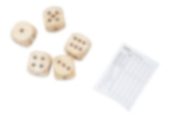 Ylisuuren Yatzy-pelin muotoinen pihapeli, jota voi pelata ystävien tai perheen kanssa. Pakkaus sisältää 5 suurta puunoppaa ja pisteytyspaperin. Yli 5-vuotiaille