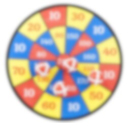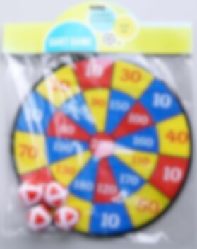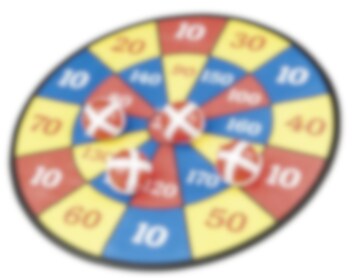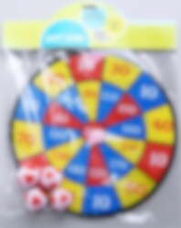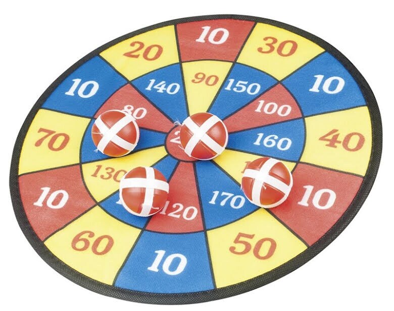 Klassinen tikkataulu tarranauhamateriaalista, jossa on tarranauhalla kiinnitettävät pallot. Tikkataulun halkaisija on 35 cm.