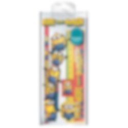 Anna kouluun paluulle hauska twisti tämän Minions-koulusetin avulla! Tämä setti sisältää kaiken, mitä tarvitaan onnistuneeseen koulupäivään: lyijykynän, kuulakärkikynän, viivottimen, terottimen ja pyyhekumin, joissa kaikissa on värikkäitä ja hauskoja rakastettujen Minionsien kuvia.