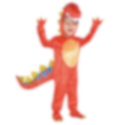 Flame Dinomite Naamiaisasu sisältää oranssinvärisen haalarin, siihen kuuluvan hännän, hanskat ja hupun, joka esittää oranssia dinosaurusta.