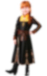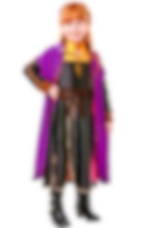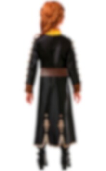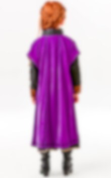 Frozen 2 - Anna Naamiaisasu Premium Edition sisältää pitkän mustan mekon jossa on upeita kullanvärisiä ja ruskeita yksityiskohtia, sekä violetin värisen viitan jossa on pinkki sisäpuoli.
