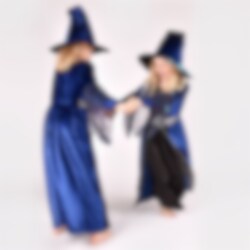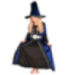 Tunne olosi maagiseksi noidaksi tässä lumoavassa sinisessä naamiaisasussa. Mekko on tehty pehmeästä sametista ja se on koristeltu kimaltavilla ja hohtavilla yksityiskohdilla, mukaan lukien vyötärönauha kimaltelevalla kuulla. Yhteensopiva,rypytetty noitahattu viimeistelee taianomaisen ilmeen.