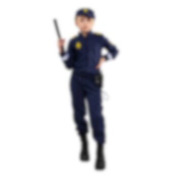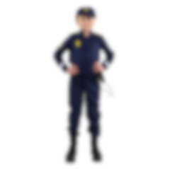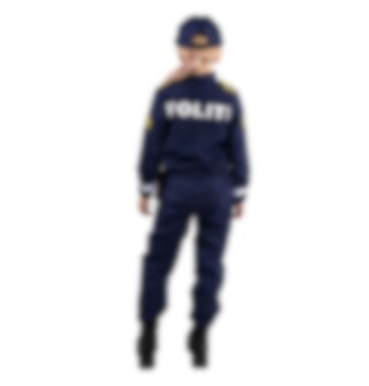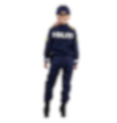 Mukana on myös tummansiniset housut, joissa on joustava vyötärö. Mukaan kuuluu myös poliisin hattu, jossa on valkoinen painatus.