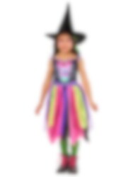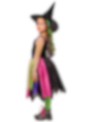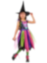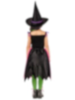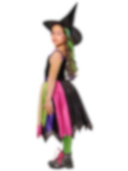 Anna lapsen muuttua taianomaiseksi ja värikkääksi pieneksi noidaksi! Tämä leikkisä naamiaisasu koostuu kimaltelevasta mekosta kirkkaissa väreissä, kuten pinkki, violetti ja limenvihreä. Tyllikerrostus antaa ihanaa volyymia. Mukana tuleva noitahattu viimeistelee Halloween-lookin.