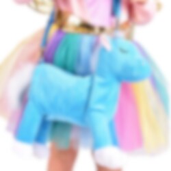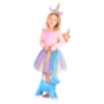 Hieno laukku, jossa on sininen pörröinen yksisarvinen, jolla on maaginen kultainen sarvi. Laukussa on säädettävä olkahihna, joten se sopii sekä pienille että vanhemmille lapsille.