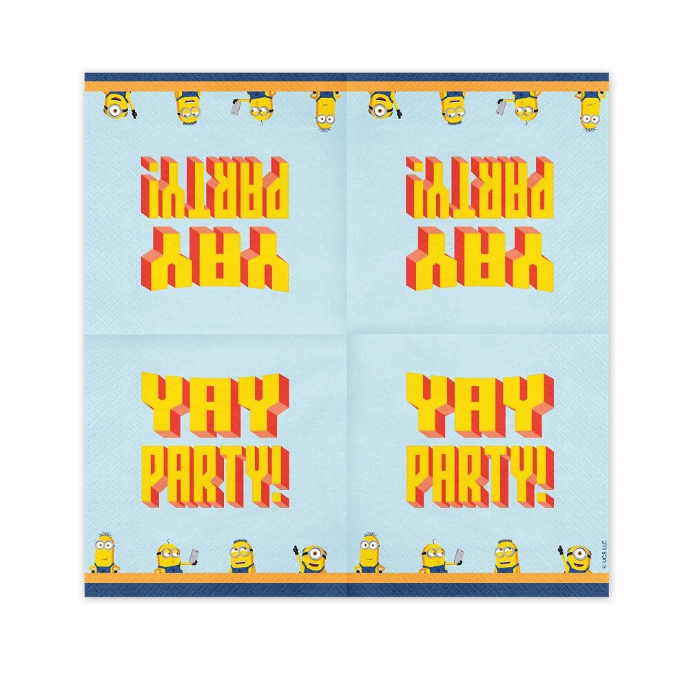 12 kpl servettejä, joissa on värikäs kuva Minionsista ja teksti "Yay Party!" – luo heti leikkisää ja juhlallista tunnelmaa kattaukseen. Täydellisiä synttärijuhliin ja helppo tapa luoda yhtenäinen teema samalla kun ne tekevät kattauksesta erityisen kutsuvan. Servetit ovat 2-kerroksisia ja mittaavat 33 x 33 cm avattuna.
